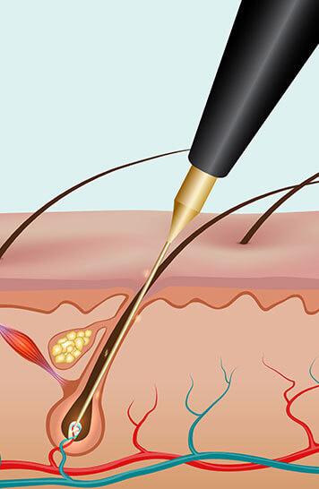 Die Nadelepilation, auch Elektroepilation genannt, ist die älteste Methode für die definitive Haarentfernung. Bei dieser Methode wird eine hauchdünne Sonde aus Chirurgenstahl, die auf Haarstärke und Follikeltiefe abgestimmt ist, bis zur Haarwurzel geführt, wo ein genau dosierter elektrischer Impuls die Haarwurzel zerstört. Das Haar kann bei einer Zerstörung nicht mehr nachwachsen. Die Elektroepilation eignet sich für alle Haarfarben, unabhängig von ihrer Stärke und Farbe. Selbst weisse Haare lassen sich damit definitiv entfernen. Für weisse Haare ist sie sogar die einzige, nachgewiesene erfolgreiche Methode zur definitiven Haarentfernung. Grundsätzlich ist die Nadelepilation nur für kleinere Areale zu empfehlen. Da immer nur die Haare epiliert werden können, die in der Wachstumsphase sind, sind mehrere Sitzungen nötig.